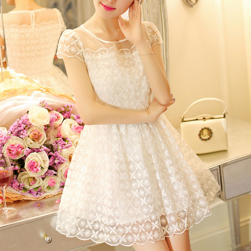 荷叶边欧根纱刺绣短袖镂空蕾丝连衣裙 夏韩系小香风短裙A字连衣裙